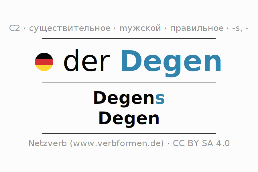 - Единственное число: der Degen, des Degens, dem Degen, den Degen