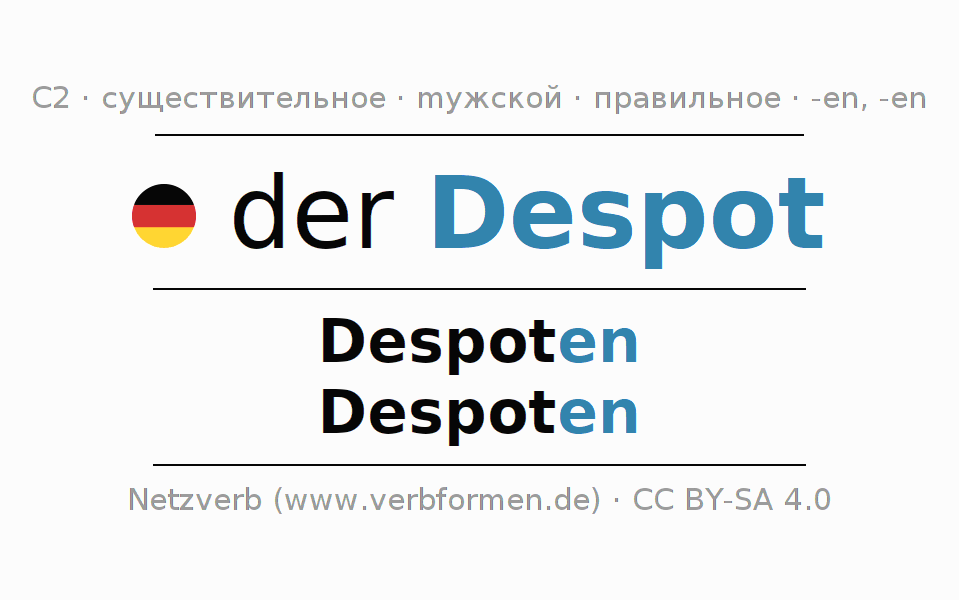 - Единственное число: der Despot, des Despoten, dem Despoten, den Despoten
