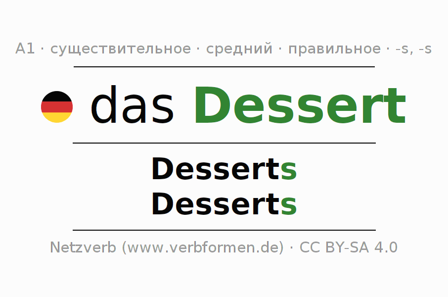 - Множественное число: die Desserts, der Desserts, den Desserts, die Desserts