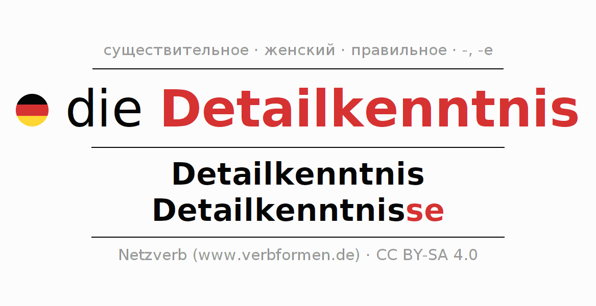 - Множественное число: die Detailkenntnisse, der Detailkenntnisse, den Detailkenntnissen, die Detailkenntnisse