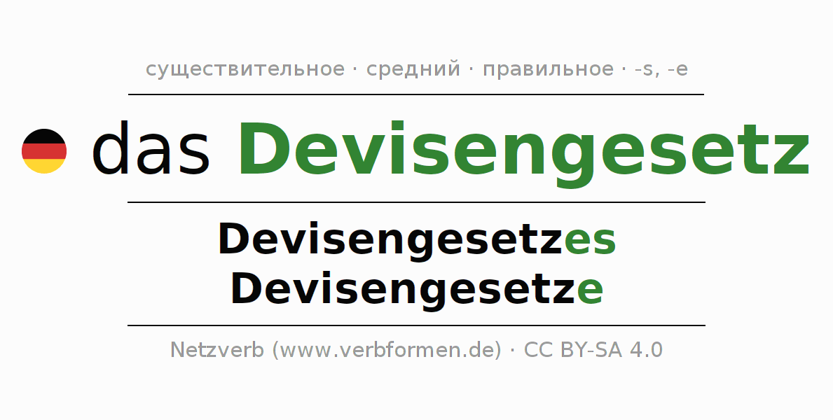 - Множественное число: die Devisengesetze, der Devisengesetze, den Devisengesetzen, die Devisengesetze