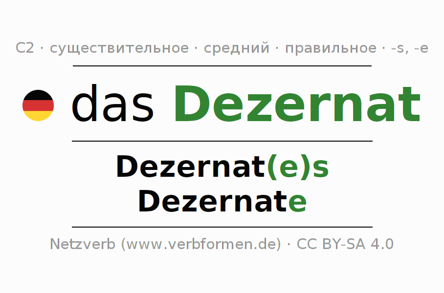 - Единственное число: das Dezernat, des Dezernat(e)s, dem Dezernat(e), das Dezernat