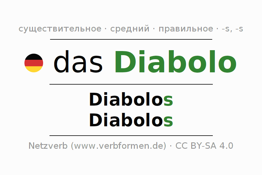 Склонение существительного Diabolo (диа́боло, диаболо) даётся в родительном падеже единственного числаDiabolos и в именительном падеже множественного числа Diabolos. Существительное Diabolo склоняется по сильному типу, получая окончания s/s. Грамматический род Diabolo средний с определённым артиклем "das" Здесь можно просклонять не только Diabolo, но и все немецкие существительные. Kомментарии ☆