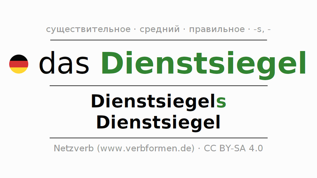 Склонение существительного Dienstsiegel (ге́рбовая печа́ть, госуда́рственная печа́ть) даётся в родительном падеже единственного числаDienstsiegels и в именительном падеже множественного числа Dienstsiegel. Существительное Dienstsiegel склоняется по сильному типу, получая окончания s/-. Грамматический род Dienstsiegel средний с определённым артиклем "das" Здесь можно просклонять не только Dienstsiegel, но и все немецкие существительные. Kомментарии ☆