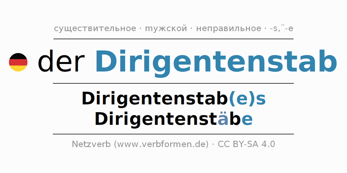 - Множественное число: die Dirigentenstäbe, der Dirigentenstäbe, den Dirigentenstäben, die Dirigentenstäbe