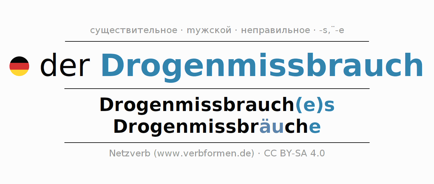 - Множественное число: die Drogenmissbräuche, der Drogenmissbräuche, den Drogenmissbräuchen, die Drogenmissbräuche