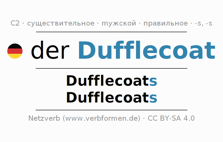 - Единственное число: der Dufflecoat, des Dufflecoats, dem Dufflecoat, den Dufflecoat