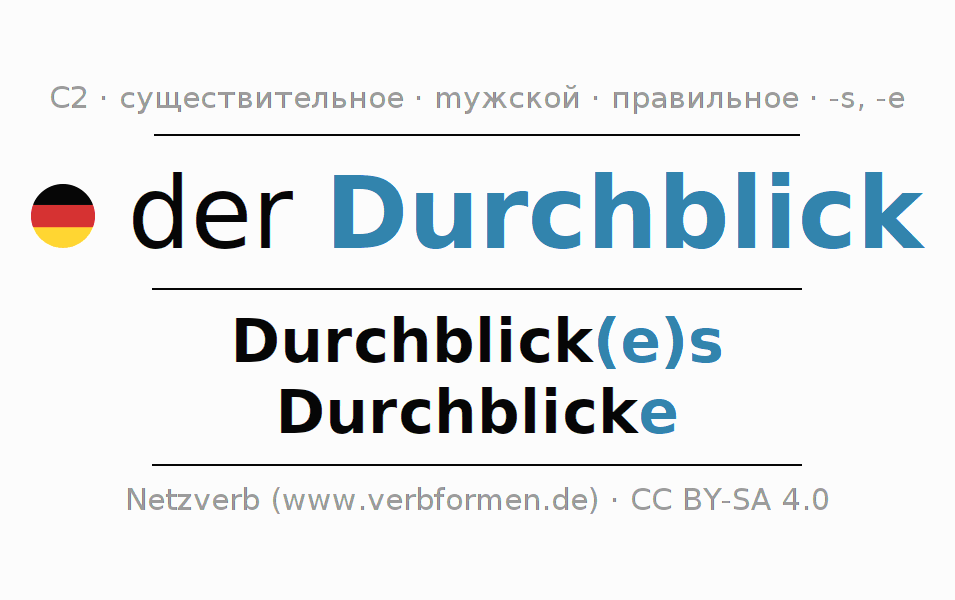 Склонение существительного Durchblick (вид, понимание) даётся в родительном падеже единственного числаDurchblick(e)s и в именительном падеже множественного числа Durchblicke. Существительное Durchblick склоняется по сильному типу, получая окончания es/e. Грамматический род Durchblick мужской с определённым артиклем "der" Здесь можно просклонять не только Durchblick, но и все немецкие существительные. Существительное включён в словарный запас обладателя сертификата знания немецкого языка уровня C2. Kомментарии ☆