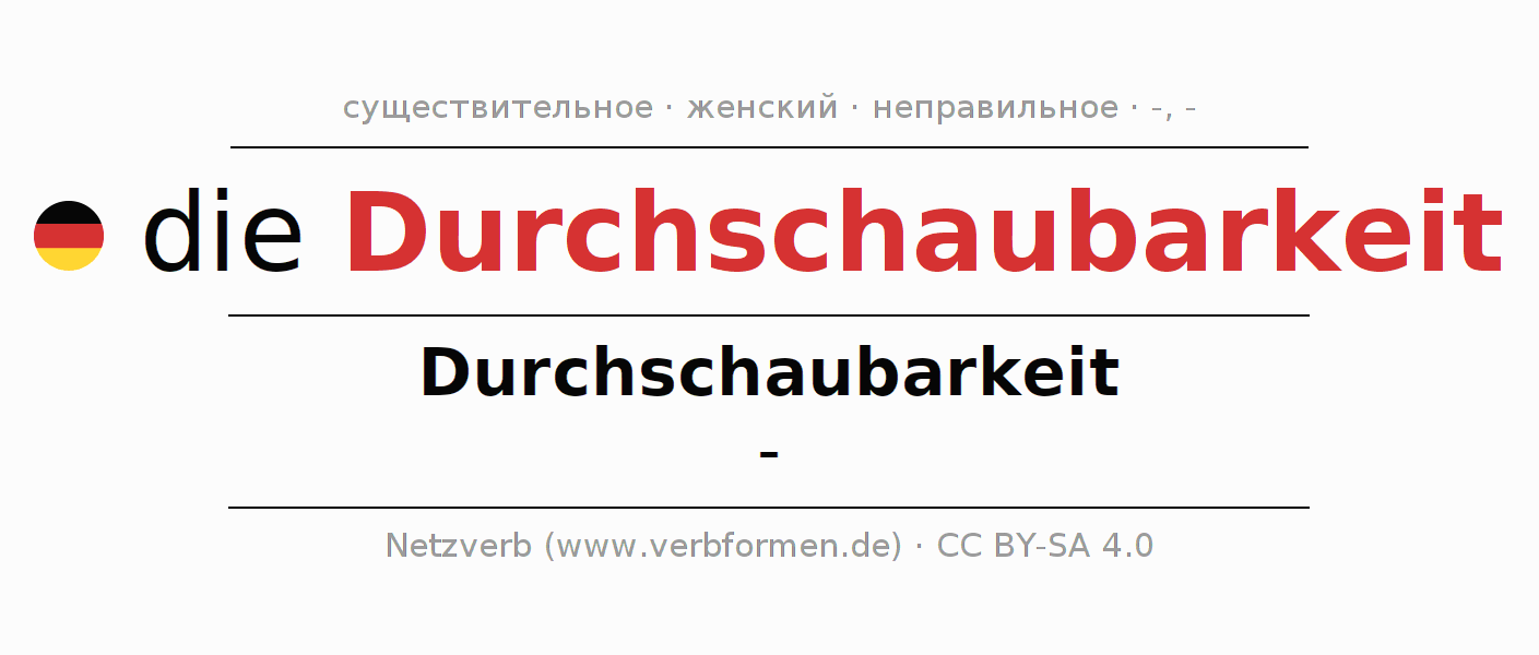 Склонение существительного Durchschaubarkeit (прозрачность) даётся в родительном падеже единственного числаDurchschaubarkeit и в именительном падеже множественного числа -. Существительное Durchschaubarkeit при склонении получает окончания -/-. Не образует форм множественного числа. Грамматический род Durchschaubarkeit женский с определённым артиклем "die" Здесь можно просклонять не только Durchschaubarkeit, но и все немецкие существительные. Kомментарии ☆