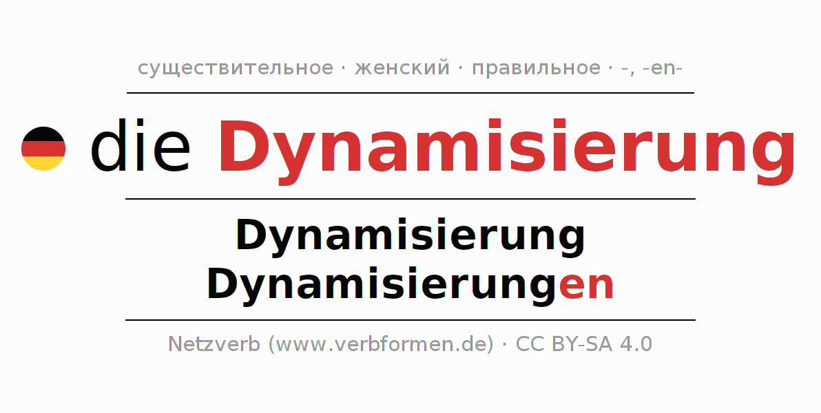 - Единственное число: die Dynamisierung, der Dynamisierung, der Dynamisierung, die Dynamisierung