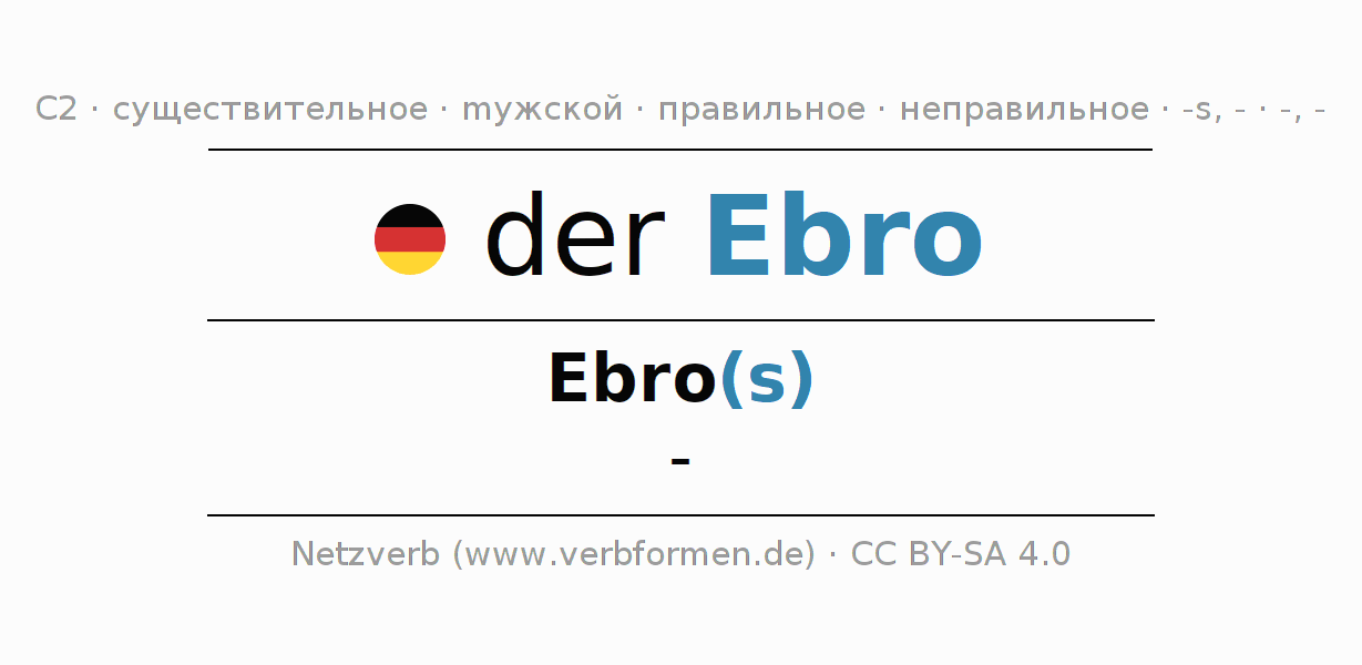 Склонение существительного Ebro (Эбро) даётся в родительном падеже единственного числаEbro(s) и в именительном падеже множественного числа -. Существительное Ebro склоняется по сильному типу, получая окончания s/-/-. Не образует форм множественного числа. Грамматический род Ebro мужской с определённым артиклем "der" Здесь можно просклонять не только Ebro, но и все немецкие существительные. Существительное включён в словарный запас обладателя сертификата знания немецкого языка уровня C2. Kомментарии ☆