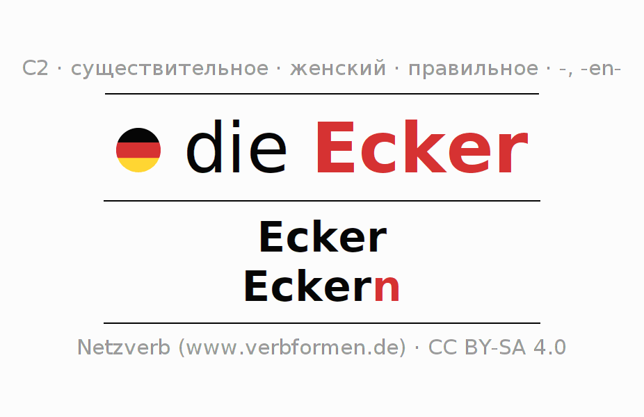 Склонение существительного Ecker (жёлудь, бу́ковый оре́шек) даётся в родительном падеже единственного числаEcker и в именительном падеже множественного числа Eckern. Существительное Ecker склоняется по слабому типу, получая окончания -/n. Грамматический род Ecker женский с определённым артиклем "die" Здесь можно просклонять не только Ecker, но и все немецкие существительные. Существительное включён в словарный запас обладателя сертификата знания немецкого языка уровня C2. Kомментарии ☆