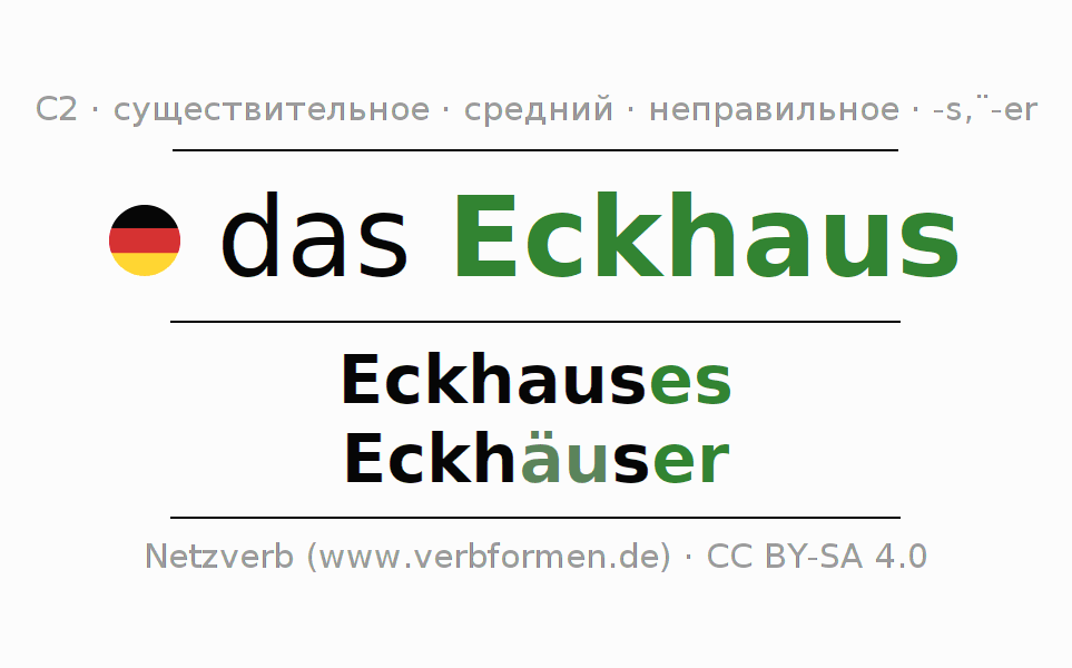 - Множественное число: die Eckhäuser, der Eckhäuser, den Eckhäusern, die Eckhäuser