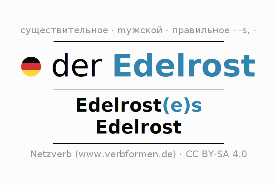 - Единственное число: der Edelrost, des Edelrost(e)s, dem Edelrost(e), den Edelrost