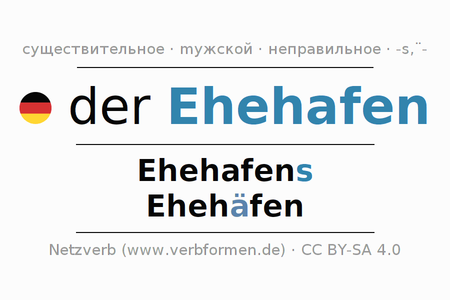Склонение существительного Ehehafen даётся в родительном падеже единственного числаEhehafens и в именительном падеже множественного числа Ehehäfen. Существительное Ehehafen склоняется по сильному типу, получая окончания s/ä-. Во множественном числе стоит умлаут. Грамматический род Ehehafen мужской с определённым артиклем "der" Здесь можно просклонять не только Ehehafen, но и все немецкие существительные. Kомментарии ☆