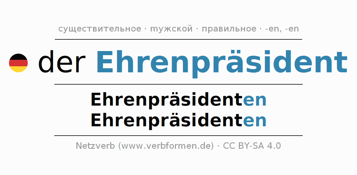 - Единственное число: der Ehrenpräsident, des Ehrenpräsidenten, dem Ehrenpräsidenten, den Ehrenpräsidenten