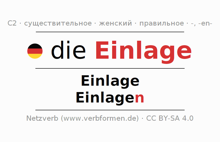 - Множественное число: die Einlagen, der Einlagen, den Einlagen, die Einlagen