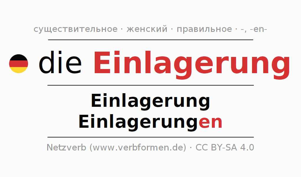 Склонение существительного Einlagerung (включе́ние, внедре́ние) даётся в родительном падеже единственного числаEinlagerung и в именительном падеже множественного числа Einlagerungen. Существительное Einlagerung склоняется по слабому типу, получая окончания -/en. Грамматический род Einlagerung женский с определённым артиклем "die" Здесь можно просклонять не только Einlagerung, но и все немецкие существительные. Kомментарии ☆