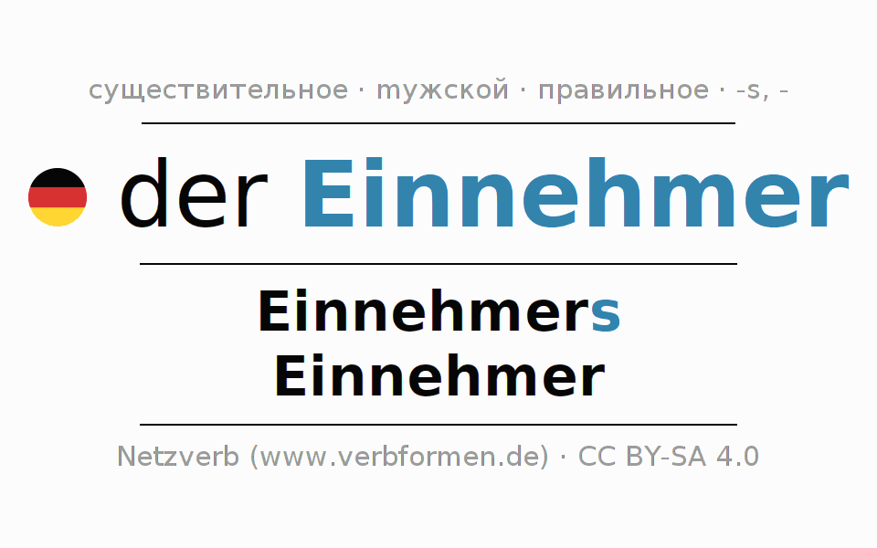 - Множественное число: die Einnehmer, der Einnehmer, den Einnehmern, die Einnehmer