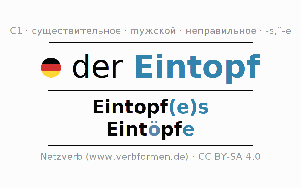 - Единственное число: der Eintopf, des Eintopf(e)s, dem Eintopf(e), den Eintopf