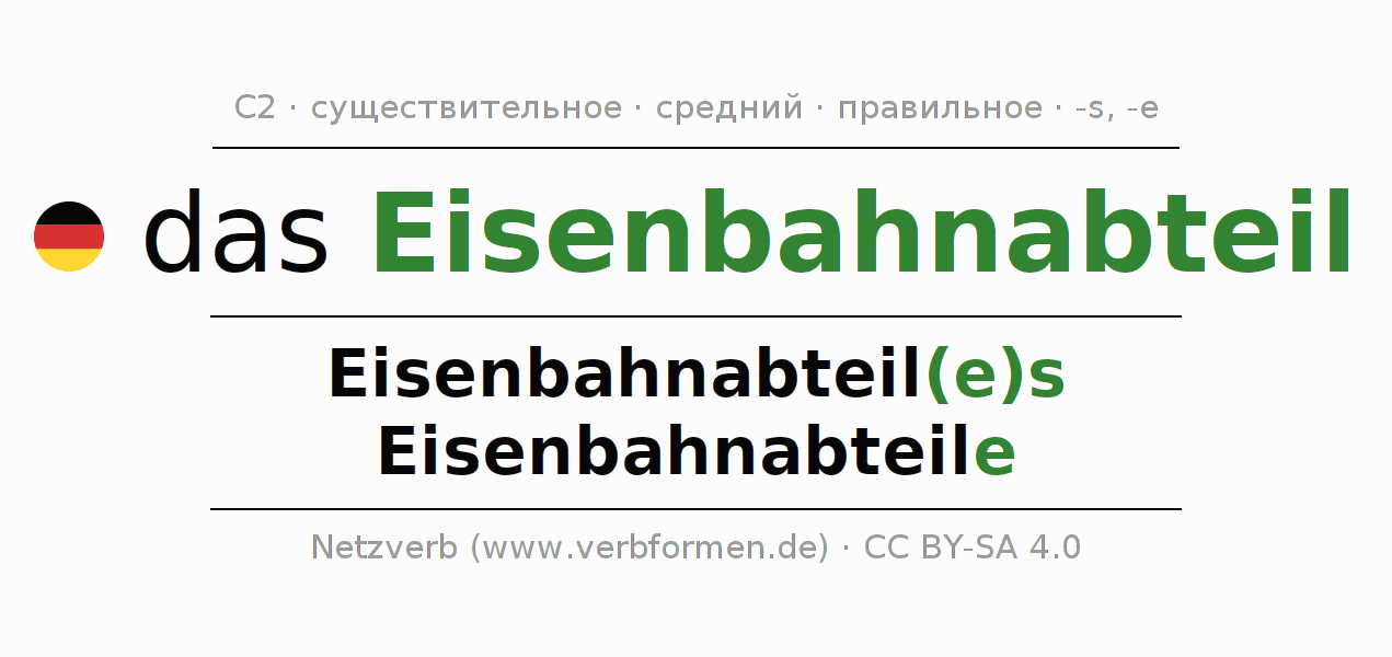 - Множественное число: die Eisenbahnabteile, der Eisenbahnabteile, den Eisenbahnabteilen, die Eisenbahnabteile