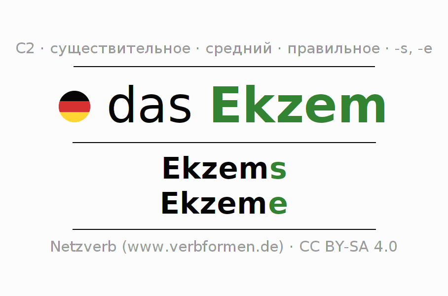 Склонение существительного Ekzem (экзема, экзе́ма) даётся в родительном падеже единственного числаEkzems и в именительном падеже множественного числа Ekzeme. Существительное Ekzem склоняется по сильному типу, получая окончания s/e. Грамматический род Ekzem средний с определённым артиклем "das" Здесь можно просклонять не только Ekzem, но и все немецкие существительные. Существительное включён в словарный запас обладателя сертификата знания немецкого языка уровня C2. Kомментарии ☆