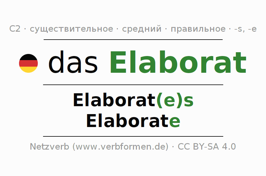 - Единственное число: das Elaborat, des Elaborat(e)s, dem Elaborat(e), das Elaborat