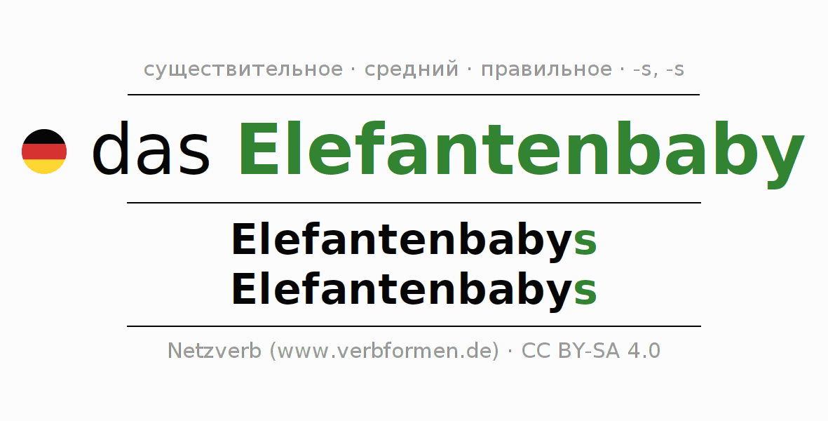 - Единственное число: das Elefantenbaby, des Elefantenbabys, dem Elefantenbaby, das Elefantenbaby