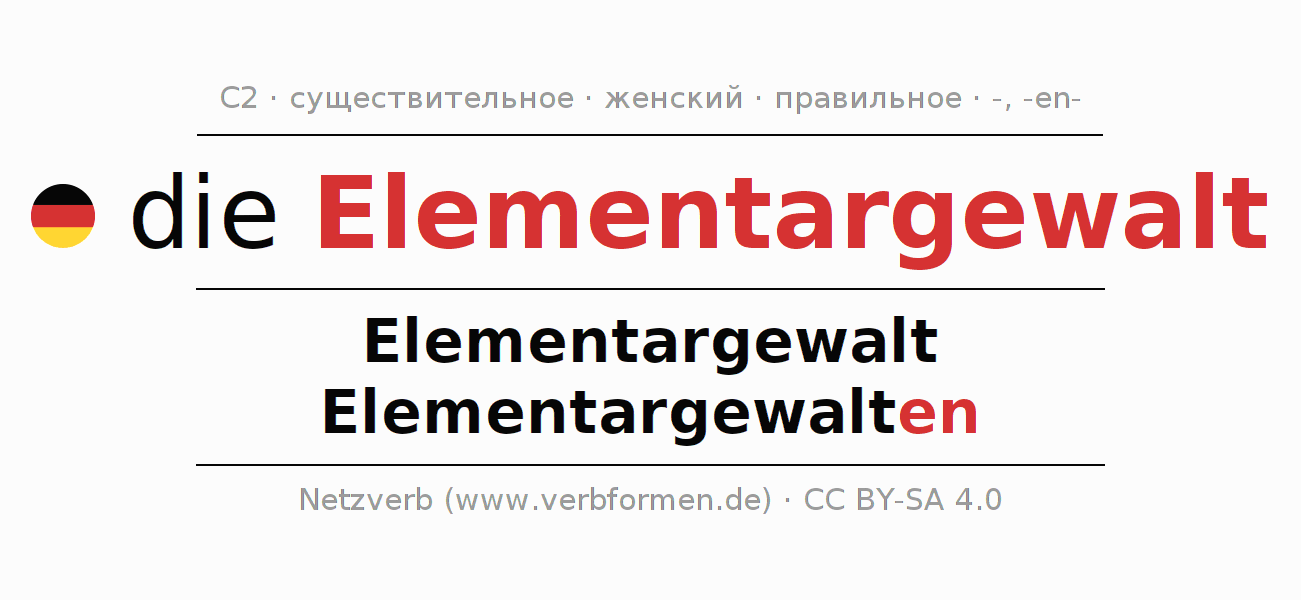 - Единственное число: die Elementargewalt, der Elementargewalt, der Elementargewalt, die Elementargewalt