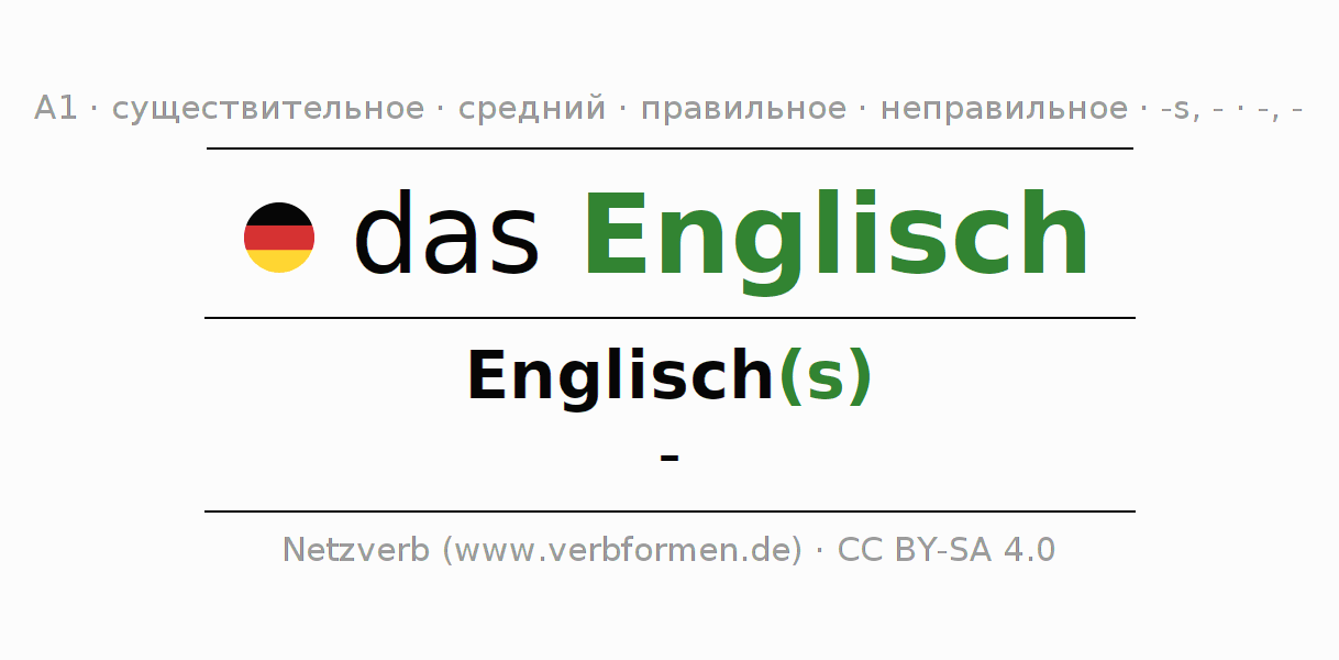 Склонение существительного Englisch (английский, английский язык) даётся в родительном падеже единственного числаEnglisch(s) и в именительном падеже множественного числа -. Существительное Englisch склоняется по сильному типу, получая окончания s/-/-. Не образует форм множественного числа. Грамматический род Englisch средний с определённым артиклем "das" Здесь можно просклонять не только Englisch, но и все немецкие существительные. Существительное включён в словарный запас обладателя сертификата знания немецкого языка уровня A1. Kомментарии ☆