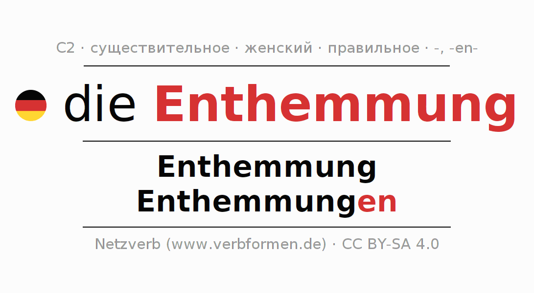 Склонение существительного Enthemmung (деблока́да, освобождение) даётся в родительном падеже единственного числаEnthemmung и в именительном падеже множественного числа Enthemmungen. Существительное Enthemmung склоняется по слабому типу, получая окончания -/en. Грамматический род Enthemmung женский с определённым артиклем "die" Здесь можно просклонять не только Enthemmung, но и все немецкие существительные. Существительное включён в словарный запас обладателя сертификата знания немецкого языка уровня C2. Kомментарии ☆