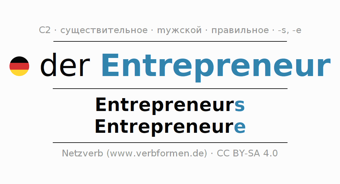 - Множественное число: die Entrepreneure, der Entrepreneure, den Entrepreneuren, die Entrepreneure