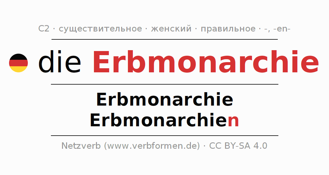 - Множественное число: die Erbmonarchien, der Erbmonarchien, den Erbmonarchien, die Erbmonarchien