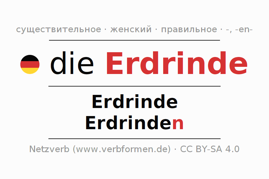 Склонение существительного Erdrinde (Земная кора, земна́я кора́) даётся в родительном падеже единственного числаErdrinde и в именительном падеже множественного числа Erdrinden. Существительное Erdrinde склоняется по слабому типу, получая окончания -/n. Грамматический род Erdrinde женский с определённым артиклем "die" Здесь можно просклонять не только Erdrinde, но и все немецкие существительные. Kомментарии ☆