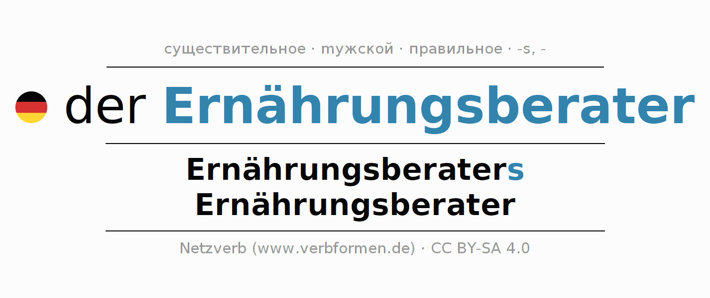- Множественное число: die Ernährungsberater, der Ernährungsberater, den Ernährungsberatern, die Ernährungsberater