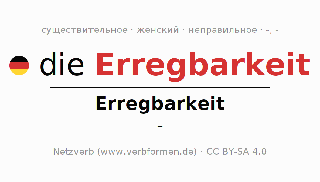 Склонение существительного Erregbarkeit (возбудимость, возбуди́мость) даётся в родительном падеже единственного числаErregbarkeit и в именительном падеже множественного числа -. Существительное Erregbarkeit при склонении получает окончания -/-. Не образует форм множественного числа. Грамматический род Erregbarkeit женский с определённым артиклем "die" Здесь можно просклонять не только Erregbarkeit, но и все немецкие существительные. Kомментарии ☆
