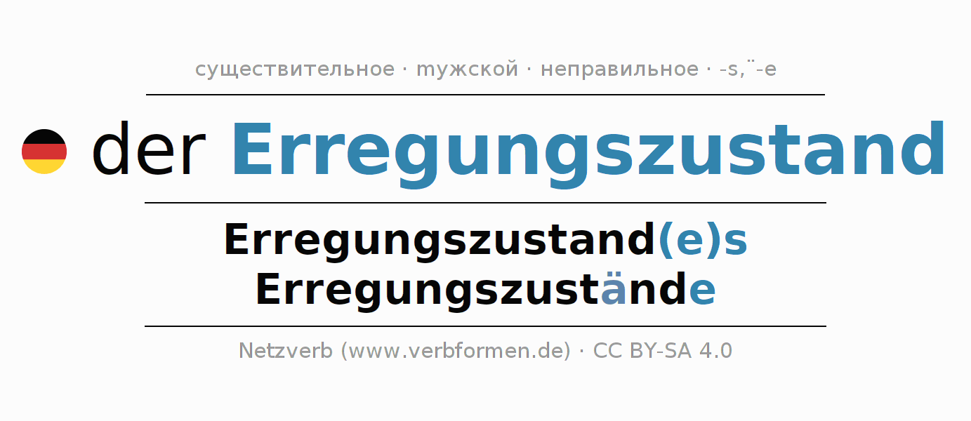 - Единственное число: der Erregungszustand, des Erregungszustand(e)s, dem Erregungszustand(e), den Erregungszustand