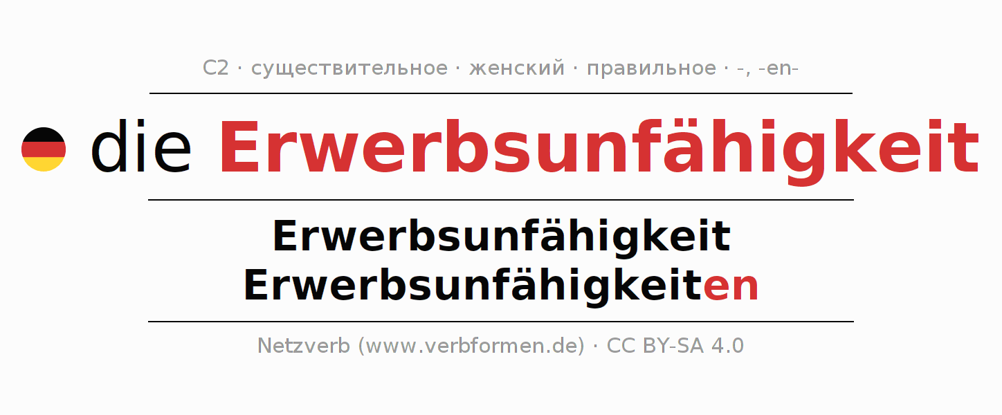 - Единственное число: die Erwerbsunfähigkeit, der Erwerbsunfähigkeit, der Erwerbsunfähigkeit, die Erwerbsunfähigkeit