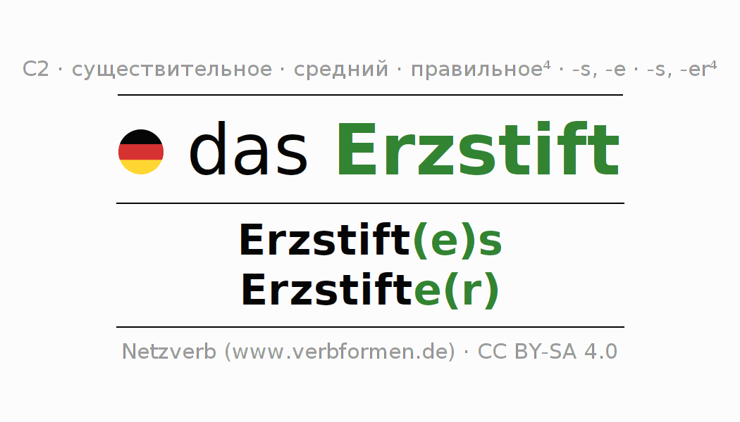 - Множественное число: die Erzstifte(r), der Erzstifte(r), den Erzstifte(r)n, die Erzstifte(r)