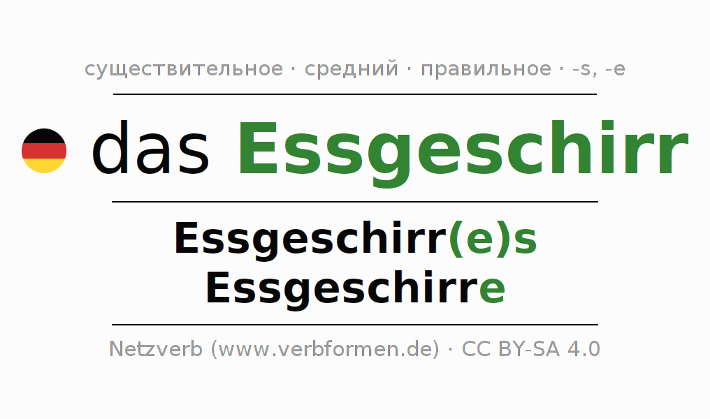 Склонение существительного Essgeschirr (посуда, столо́вая посу́да) даётся в родительном падеже единственного числаEssgeschirr(e)s и в именительном падеже множественного числа Essgeschirre. Существительное Essgeschirr склоняется по сильному типу, получая окончания es/e. Грамматический род Essgeschirr средний с определённым артиклем "das" Здесь можно просклонять не только Essgeschirr, но и все немецкие существительные. Kомментарии ☆