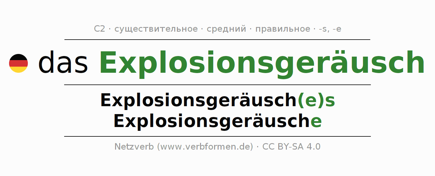 - Множественное число: die Explosionsgeräusche, der Explosionsgeräusche, den Explosionsgeräuschen, die Explosionsgeräusche