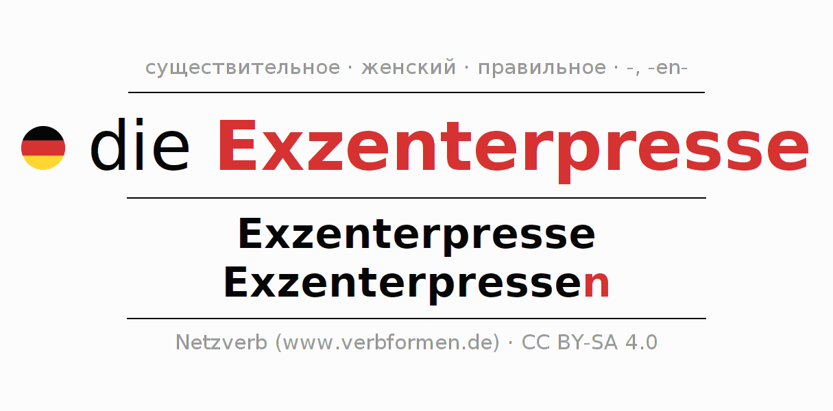 - Единственное число: die Exzenterpresse, der Exzenterpresse, der Exzenterpresse, die Exzenterpresse