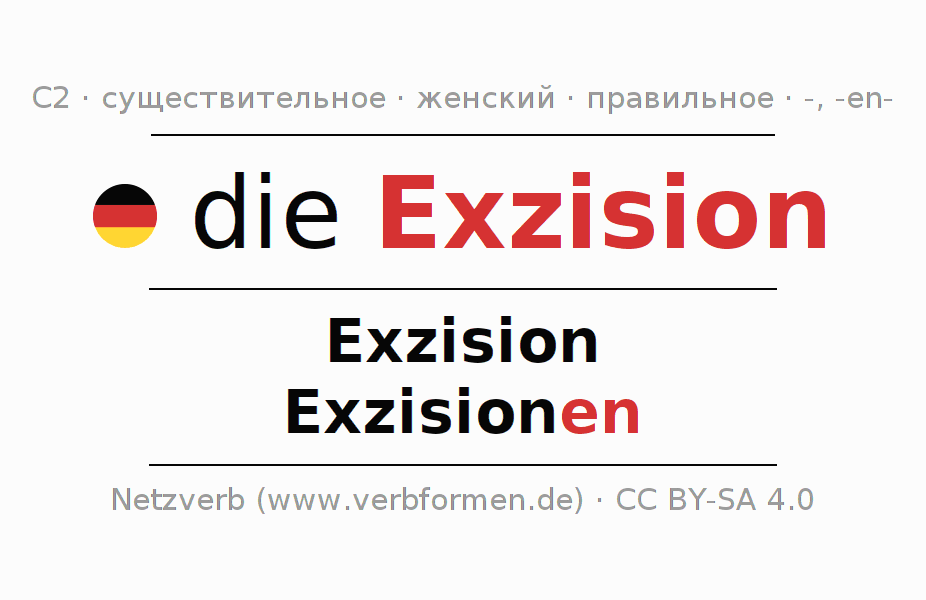 - Единственное число: die Exzision, der Exzision, der Exzision, die Exzision