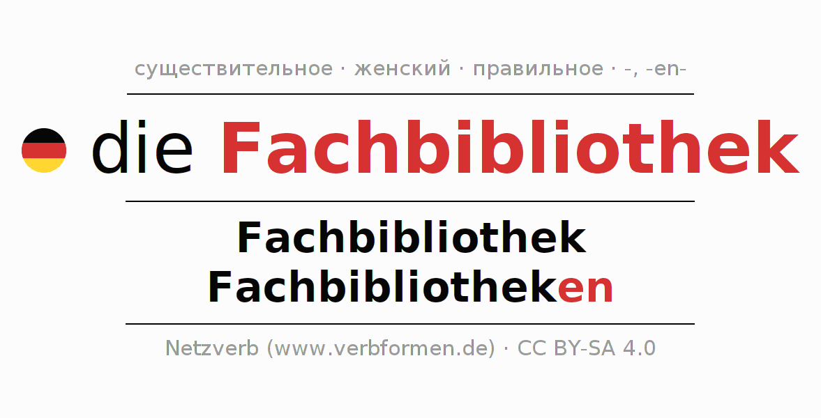 - Множественное число: die Fachbibliotheken, der Fachbibliotheken, den Fachbibliotheken, die Fachbibliotheken