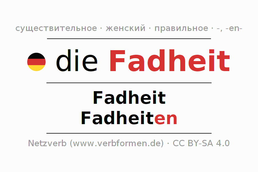 Склонение существительного Fadheit (безвку́сица, безвкусица) даётся в родительном падеже единственного числаFadheit и в именительном падеже множественного числа Fadheiten. Существительное Fadheit склоняется по слабому типу, получая окончания -/en. Грамматический род Fadheit женский с определённым артиклем "die" Здесь можно просклонять не только Fadheit, но и все немецкие существительные. Kомментарии ☆