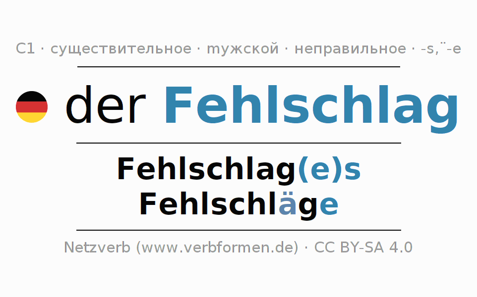 - Множественное число: die Fehlschläge, der Fehlschläge, den Fehlschlägen, die Fehlschläge
