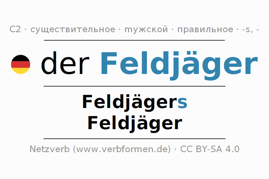 - Множественное число: die Feldjäger, der Feldjäger, den Feldjägern, die Feldjäger