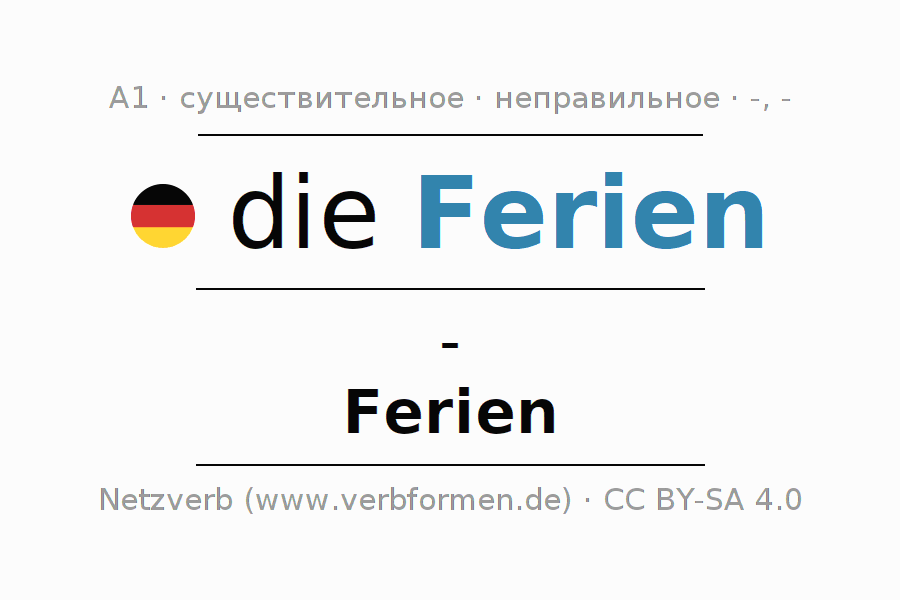 Склонение существительного Ferien (каникулы, отпуск) даётся в родительном падеже единственного числа- и в именительном падеже множественного числа Ferien. Существительное Ferien при склонении получает окончания /-. Не образует форм единственного числа. Однако существительное может употребляться в другом роде и с другим артиклем. Здесь можно просклонять не только Ferien, но и все немецкие существительные. Существительное включён в словарный запас обладателя сертификата знания немецкого языка уровня A1. Kомментарии ☆