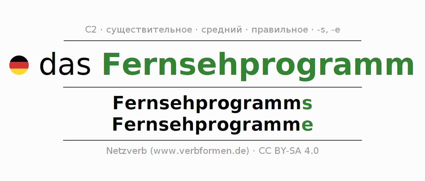 - Множественное число: die Fernsehprogramme, der Fernsehprogramme, den Fernsehprogrammen, die Fernsehprogramme