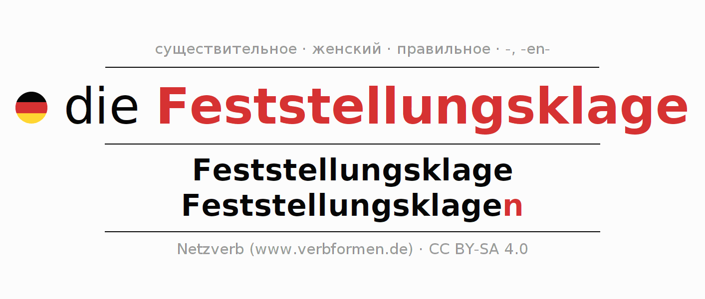 - Множественное число: die Feststellungsklagen, der Feststellungsklagen, den Feststellungsklagen, die Feststellungsklagen
